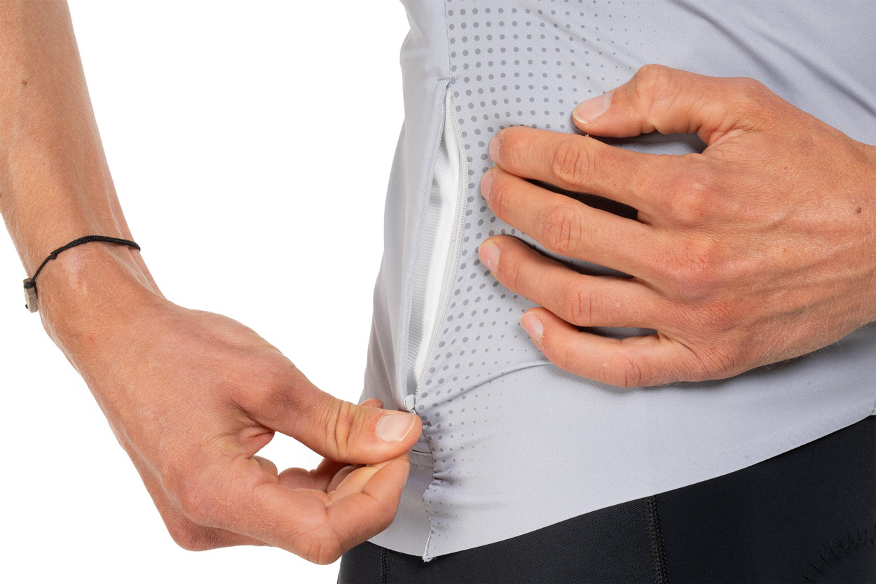 enganliegend, weicher Innensaum mit breitem Silikonband, durchgehender Frontreißverschluss, 3-teilige Rückentasche, wasserabweisende Reißverschlusstasche hinten, widerstandsfähiges und schnelltrocknendes Funktionsmaterial, nahtfreier Schulterbereich, reflektierende Elemente