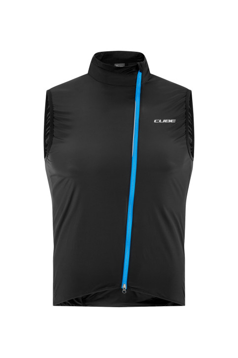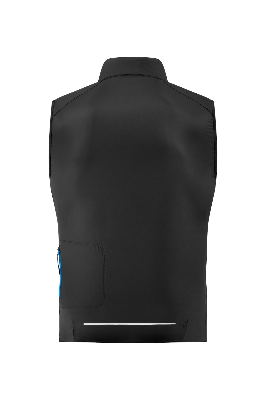 ultraleichte, leistungsorientierte Windweste, funktionale versetzte Reißverschlusskonstruktion, weicher, mit Futter ausgekleideter Kragen, wind- und wasserabweisendes Material, hochgradig packbar und kompakt, strategisch platzierte reflektierende Details, konturiert geformte Saumkonstruktion