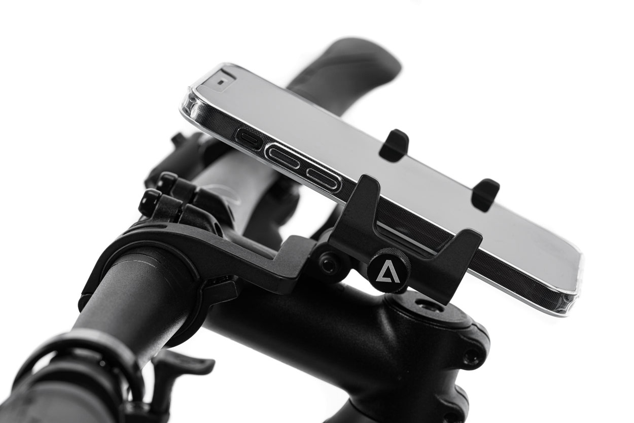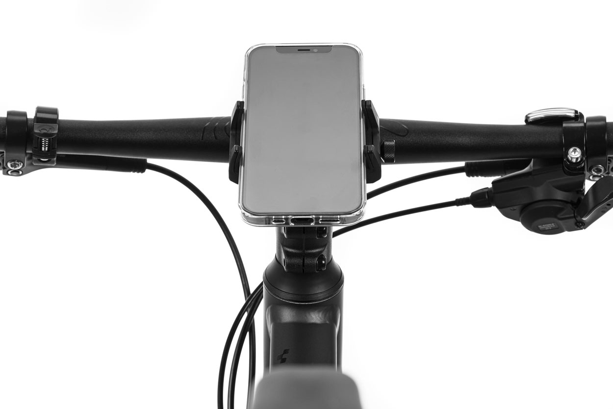 Variabel verstellbare Handyhalterung, für Breiten von 67-82mm, max. Handyhöhe: 14cm, 360° drehbar, Längsposition stufenlos verstellbar, Winkel verstellbar, Handy mittig auf dem Vorbau, fester Halt durch Silikonpads